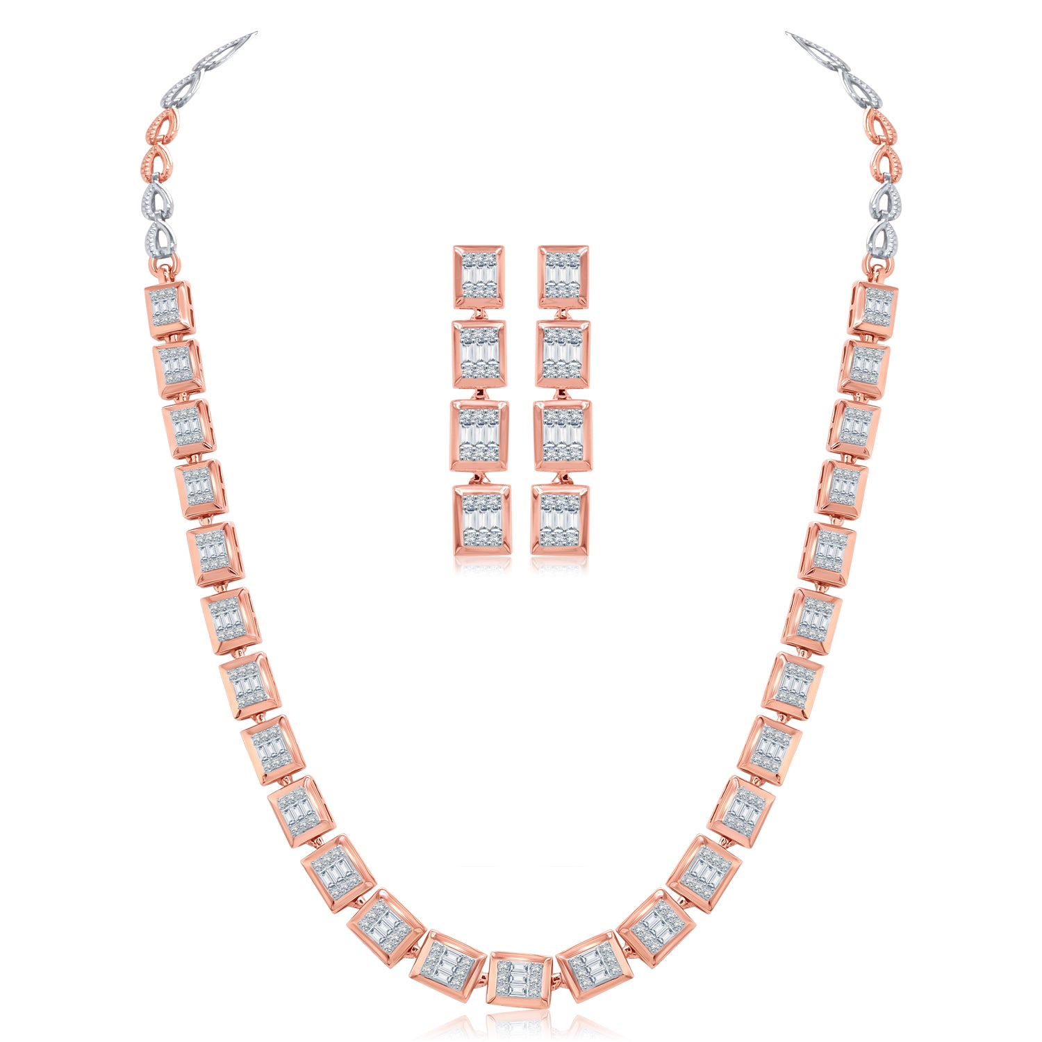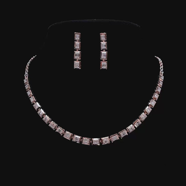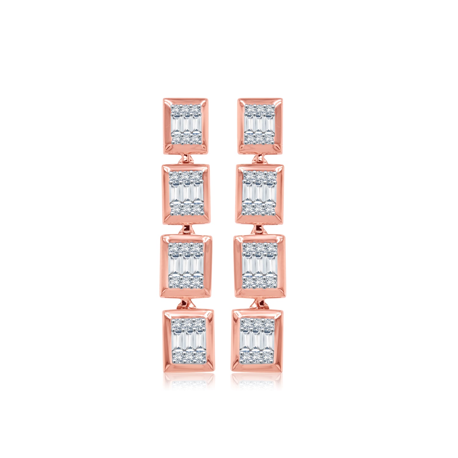 This Single Layer Baguette-Cut Diamond Necklace Set, crafted with 14kt Rose Gold, belongs to that rare, whispered category of elegance. Each diamond, like a shard of frozen daylight, is set in a perfect line—as though someone gathered fragments of the horizon just before dawn and stitched them into a ribbon of light. Choose a sleek hairstyle or simple up-do to let the baguette cuts shine.